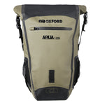 Oxford's Aqua Bags are one of the easiest ways to get your gear from A to B, safe and dry. They are made from tough PVC tarpaulin, which is welded to form waterproof seams. Key Features• 25 litre capacity backpack• Waterproof roll top closure with tension straps• Large rear external pocket for hydration pack (not included) • Extra deep front pocket with water resistant zip• Adjustable compression chest and waist straps• Moulded ergonomic soft grip carry handle• Removable padded waits belt• Two side mesh pockets• Webbed loop for tail light attachment• Reflective detail for improved visibility• Wipe clean waterproof main compartment with welded seams• Available in Khaki/Black, Black, Black/Grey/Fluo, Black/Fluo, Grey/WhiteApprox size when filled:• 50cm (H) x 28cm (W) x 20cm (D)